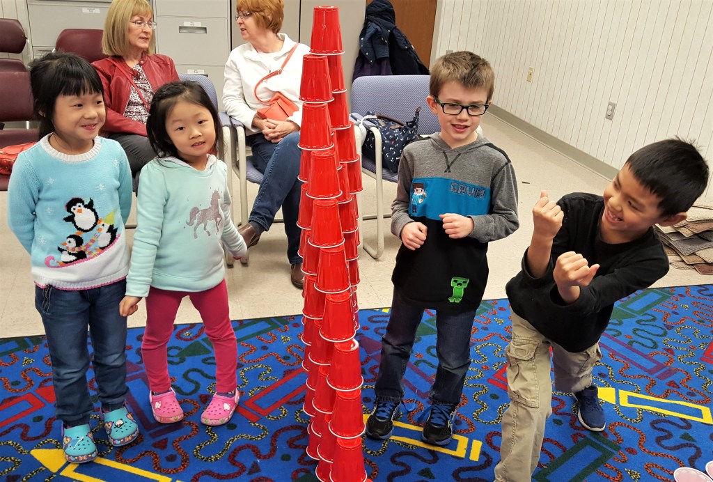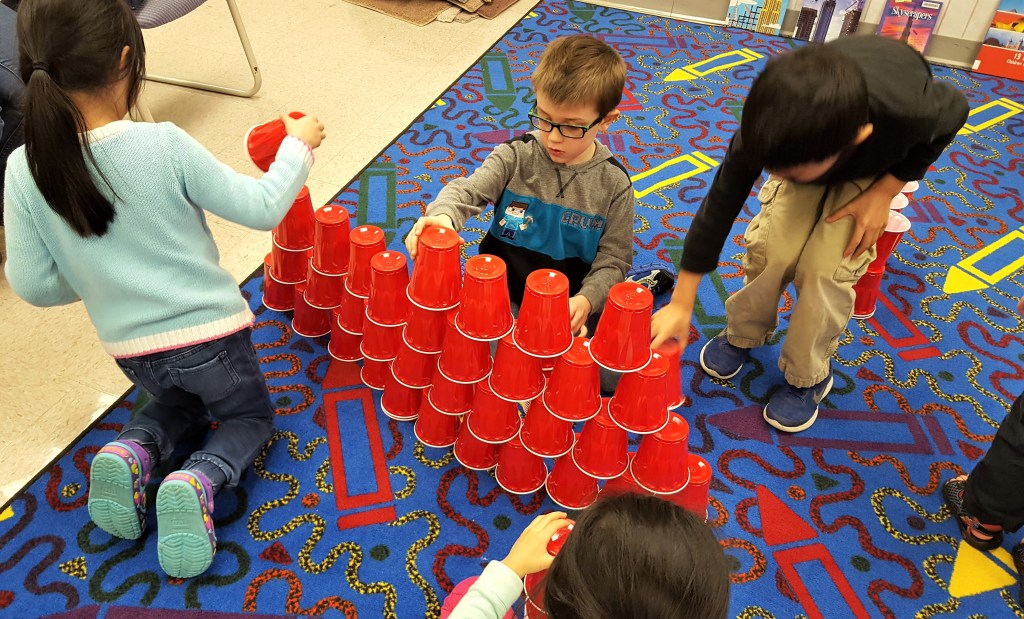 Our first station represented the Three Little Pig’s straw house. We had loads of flimsy plastic cups and challenged the kids to make a structure that would withstand a hair dryer blowing at it. This group’s structure didn’t do too well with the hairdryer, but another group’s who made a more dense structure held up well.