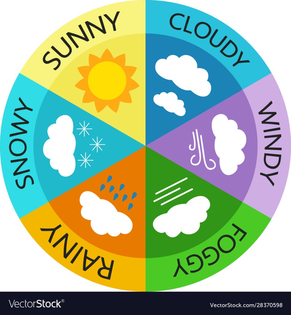 This isn’t my weather wheel, but just a picture I grabbed online to show as an example. Unfortunately I can’t get my weather wheel (cause of quarantine), so this will just help us talk about it for now! I use a fastener in the middle for mine with a bold arrow that can circle around to point to the different weather types. Then, at the end of each page in the book, I ask them to identify what kind of weather is on that page and invite a child to turn the weather wheel arrow.