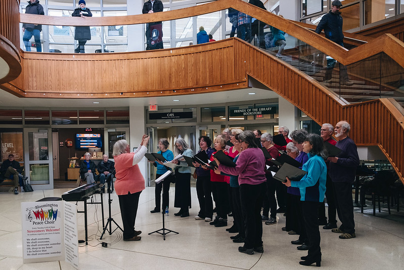 First, we invited our town’s Peace Choir, who sang in our atrium (oh man, the acoustics! It traveled up to the 2nd floor (our adult floor) and even to Administration on the 3rd floor). They sang just for 20 minutes, but people gathered around the entire atrium, the stairs leading up to the 2nd and 3rd floors to watch and sing with them. This is where our goal to show the historical side of the civil rights movement came in.