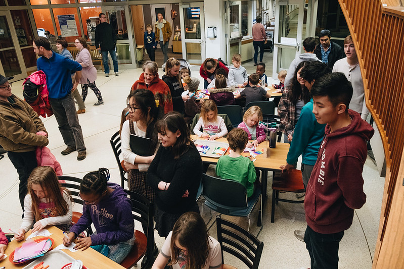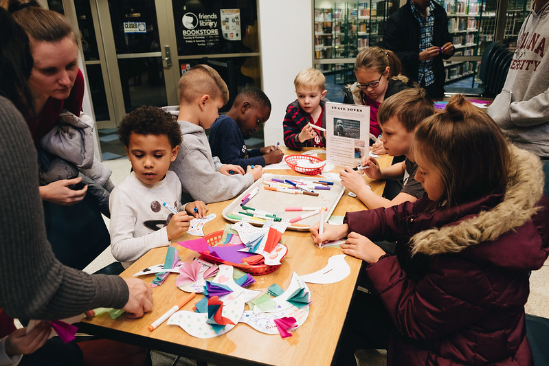 After the choir finished, we set up tables in the atrium and had volunteers from the high school’s diversity club help prep and lead some crafts (they showed up an entire hour early 0.0). We had the kids make Peace Doves out of cardstock birds with a slit in the middle to place colorful tissue paper for wings.