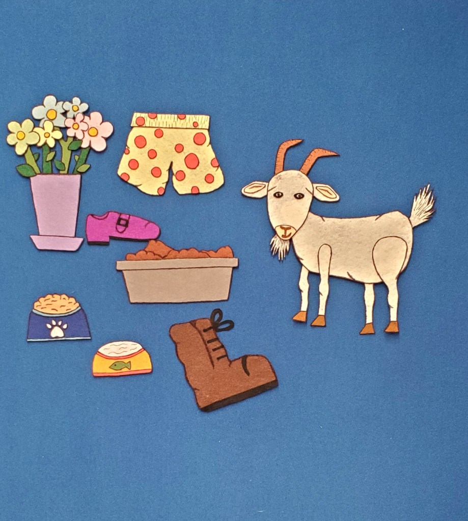 I LOVE Petr Horáček, and honestly, this story is the entire reason I wanted to do a goat themed storytime! This story features a greedy goat who is tired of eating grass and herbs and wants a taste of something different. However, eating the cat’s milk, the dog’s food, the pig’s potato peelings, the farmer’s wife’s flowers, the farmer’s daughter’s shoe, and the farmer’s underwear makes goat sick. All the animals/people get new food/items and goat feels better…until she eats the farmer’s boot.