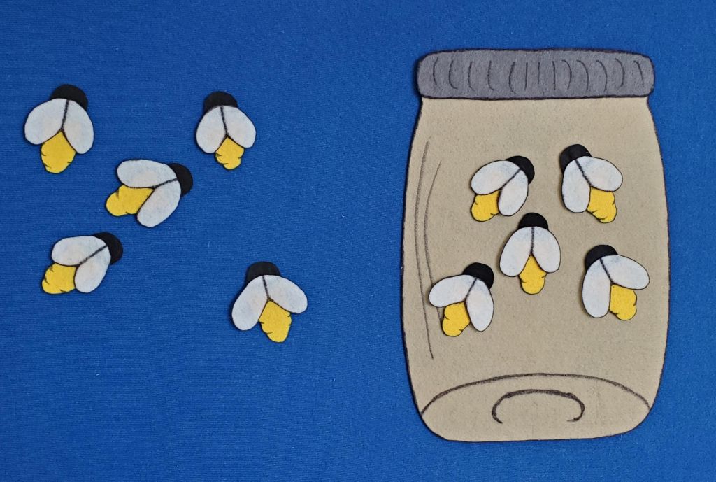 This was a fun book/felt to try out! It’s a great counting story, but I didn’t anticipate it tricking the kids as much as it did. The book emphasizes counting the fireflies that get put in the jar, but since I began with all ten out on the board – moving them to the jar – the kids called out the number for the fireflies that were outside of the jar instead. We worked through it, though!