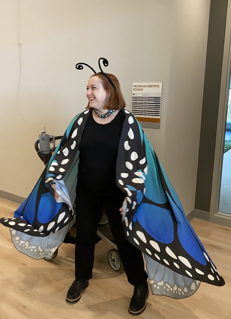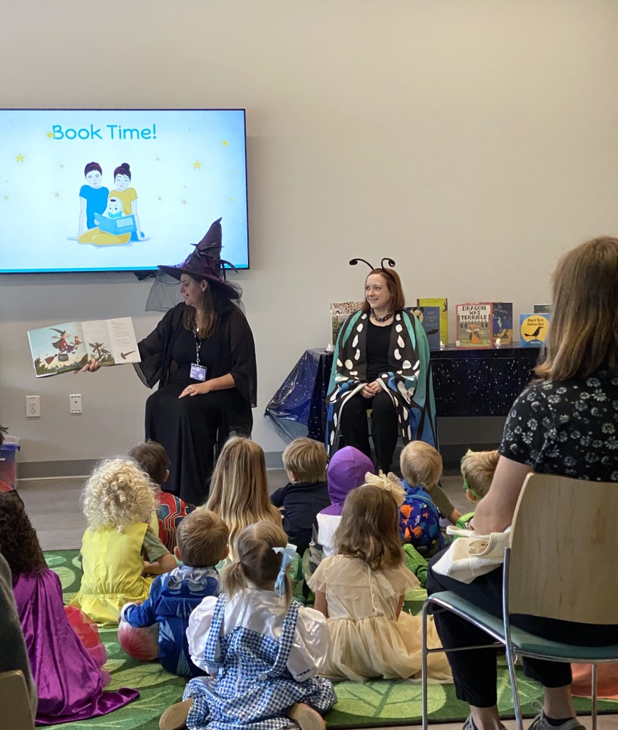 Each year, C and I do a special Halloween storytime at our branch that ends in a trick or treat parade through the library. We station staff members at the usual desks and throughout the library with candy, stickers, etc in which the kids will parade around in their costumes and practice trick or treating. It’s a wholesome and fun time that our entire staff gets into.