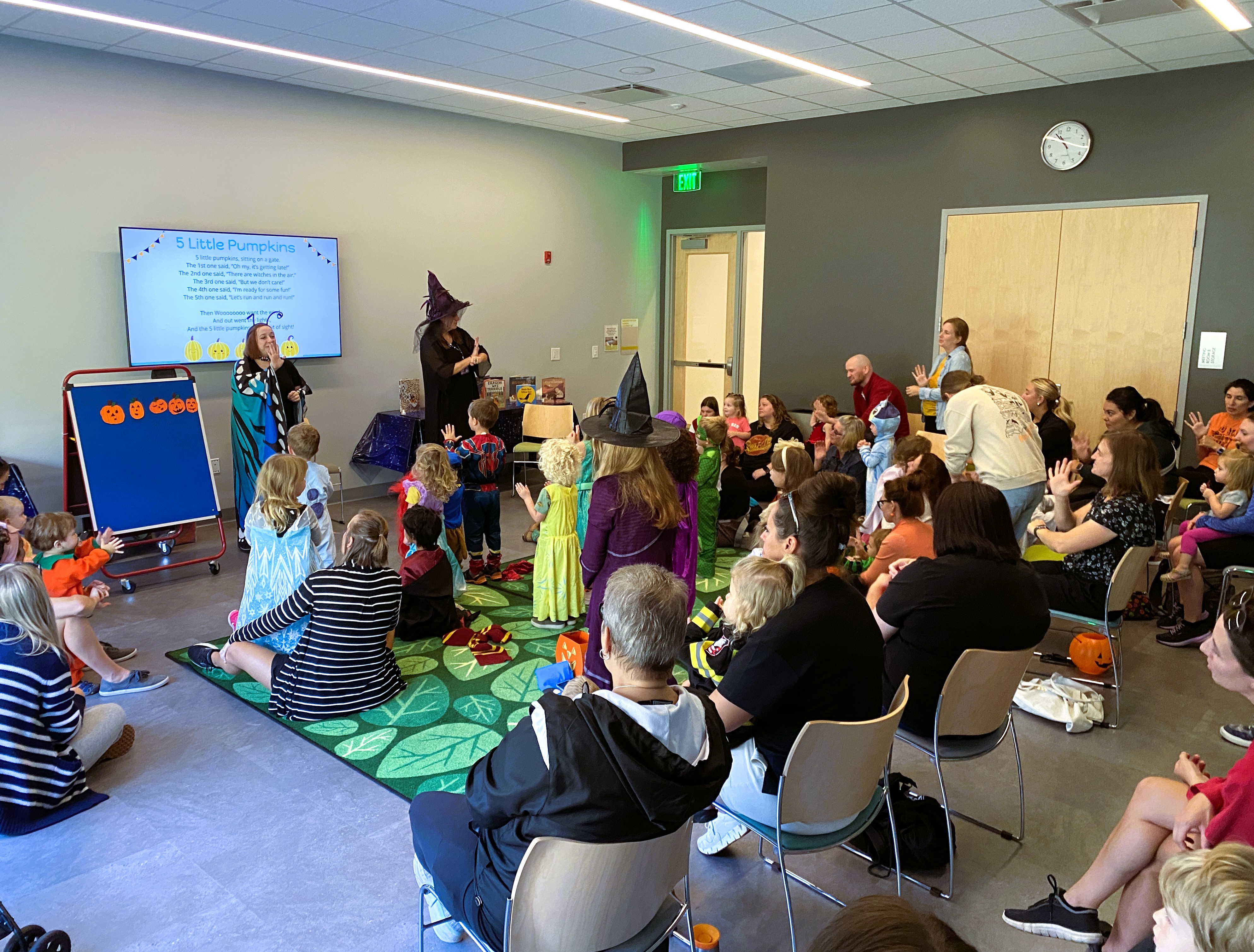 Transition: It’s finally time! We’re going to line up and go trick or treating in the library! But first, let’s practice what we’re going to say here. C, can you show us how you trick or treat? [C and I demostrate walking up to each other, knocking on a door, and then saying “Trick or treat!” We then pretend to give candy and make sure we say “Thank you!”] Now your turn, everyone! Let’s practice. Can you all knock on a pretend door and when C and I answer, you’ll say…what was it again? [let kids answer and then practice]