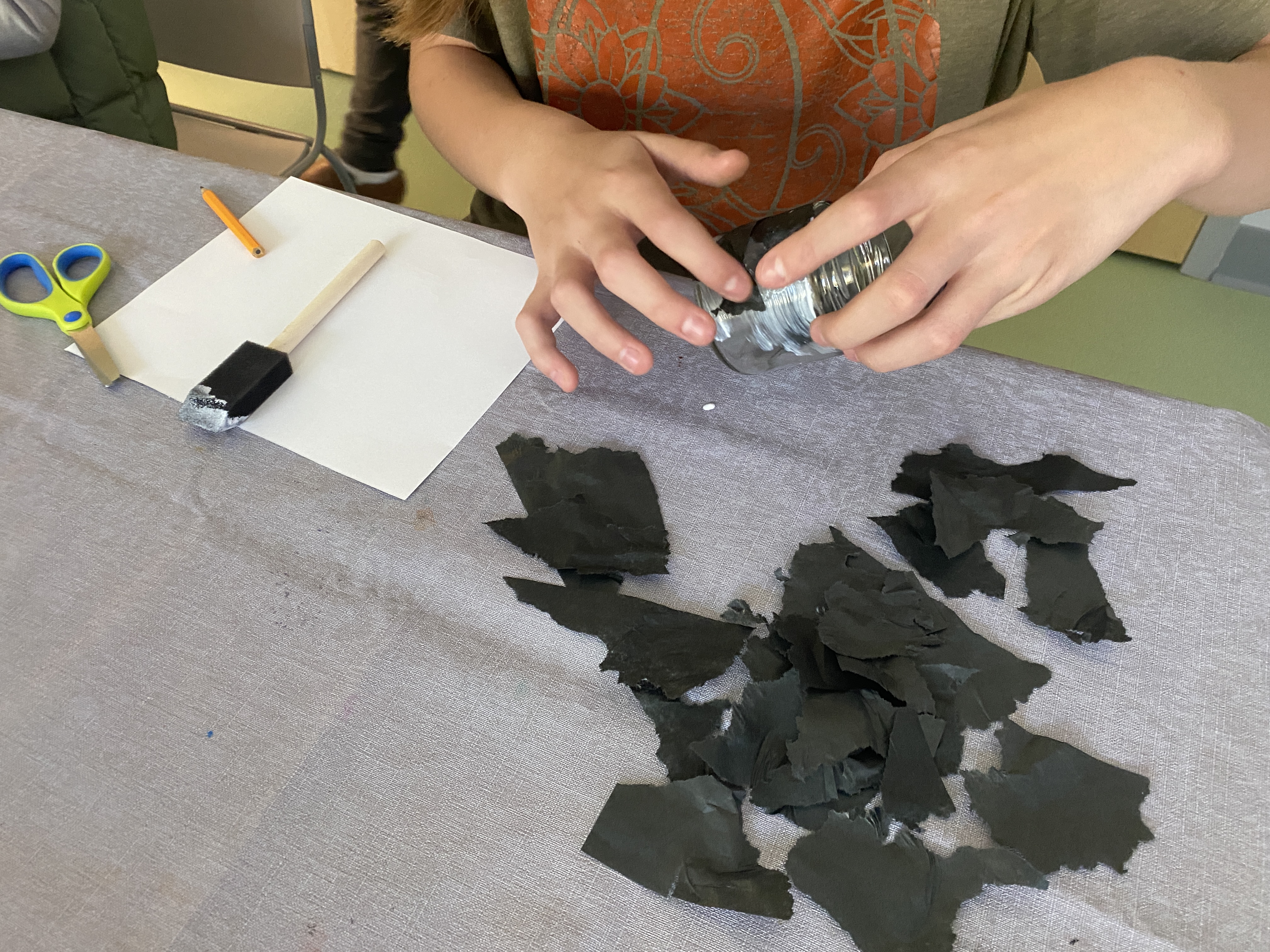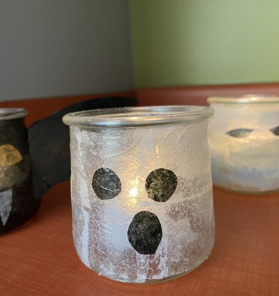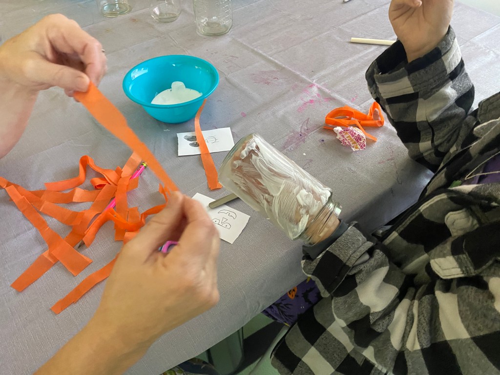 First, the kids were asked to think about what halloween-ish thing they wanted to make. We had them sketch their idea on paper and to think about what color tissue paper they’d need for their idea. Then they could pick up their supplies and choose their jars from the supply table we set up.