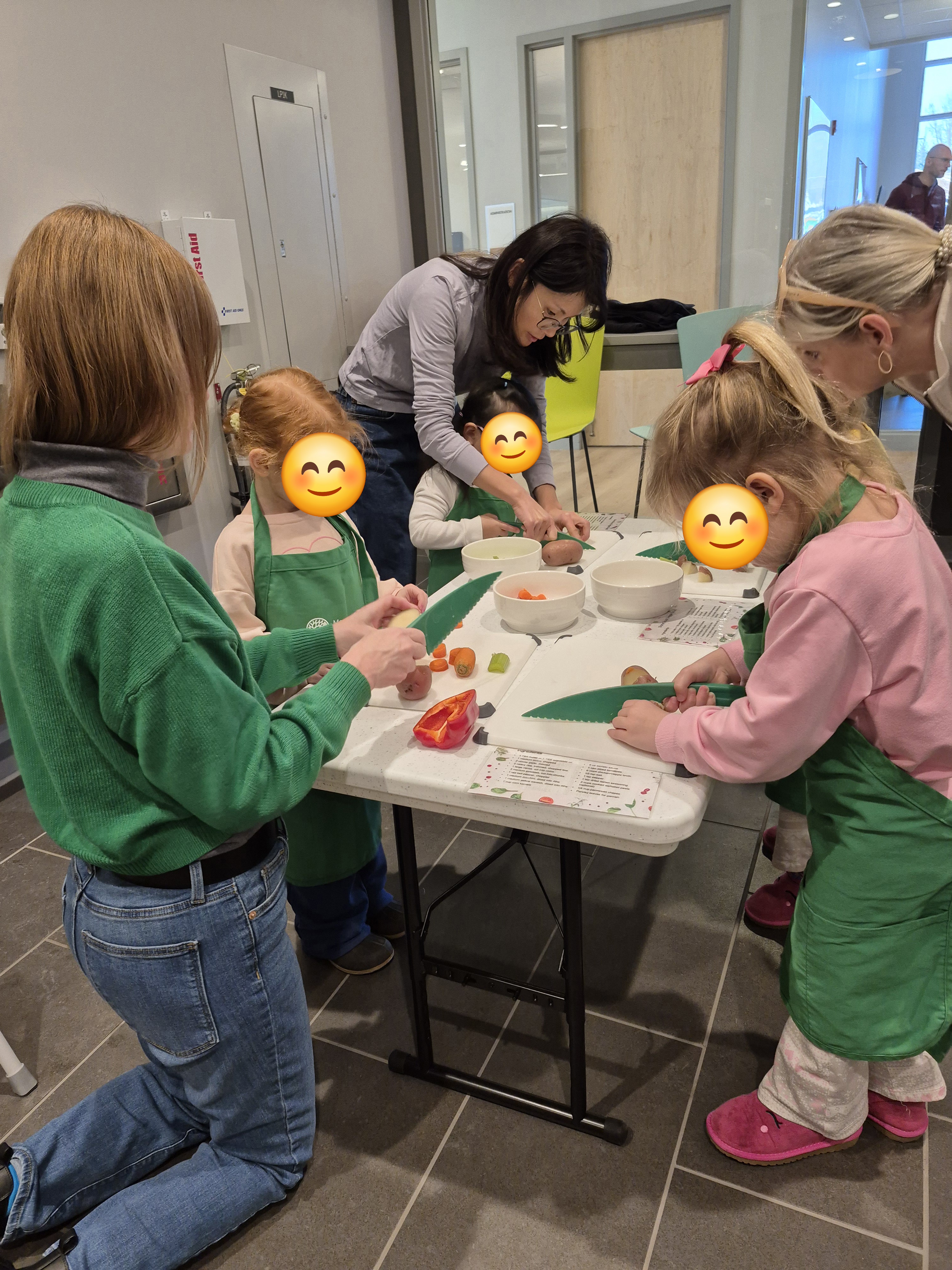 Speaking of veggies…This was one of the complications we needed to address as we were planning the program. Some veggies are easy to chop, even with the kid-safe knives we purchased for the program series. However, we were worried that carrots and potatoes would prove difficult for preschoolers. We thought about it a lot and determined that parboiling them for a short time before the program would make them soft enough for preschoolers to cut fairly easily.