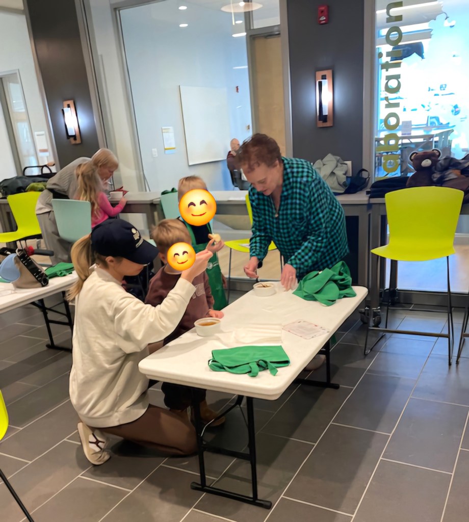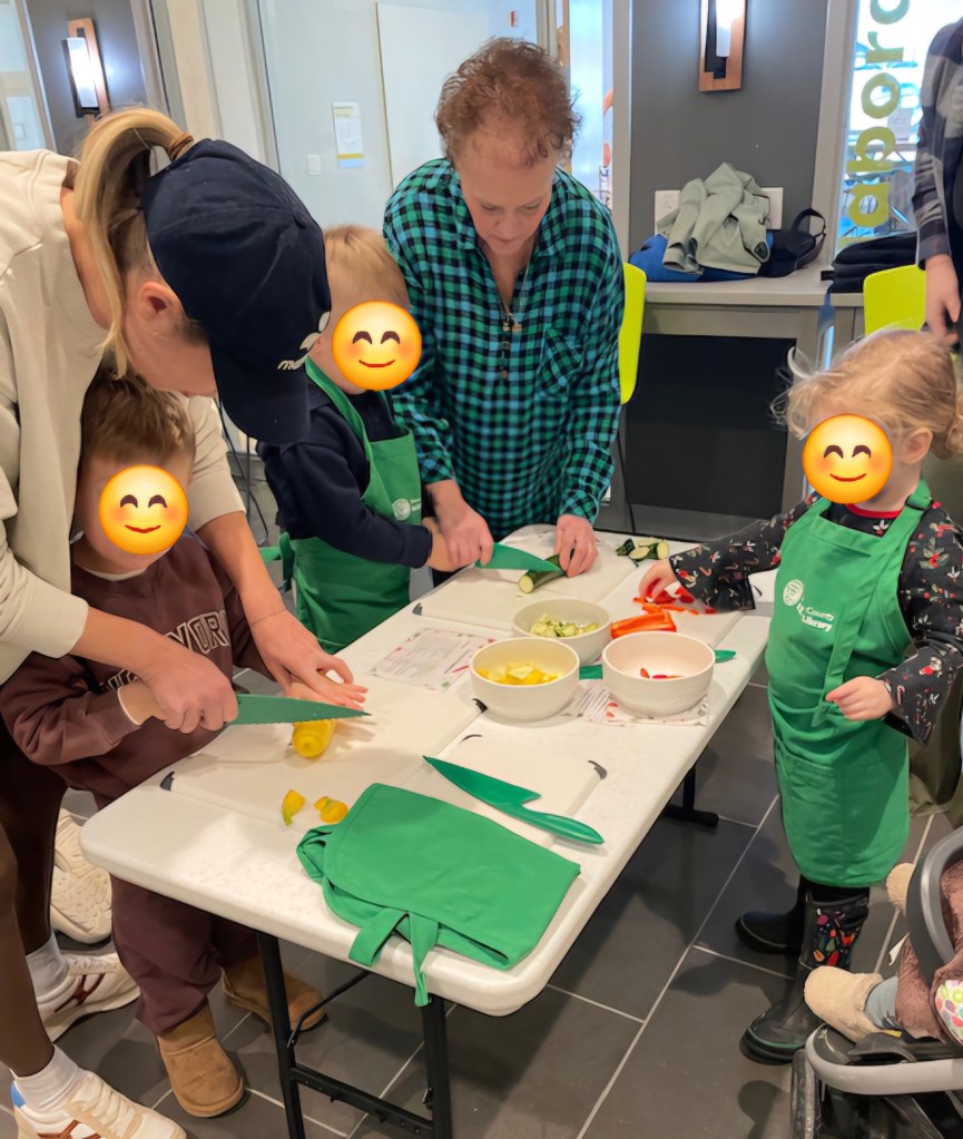 Welcome & Safety: We started our program as we always do with our kitchen programs. We talk about how the kitchen has some tools in it that need a healthy dose of respect and we all need to use safe bodies while in the kitchen. We reiterate that our grownups are expected to be actively engaged and help their child wherever they can. Another small part of safety is making sure we’re washing our hands before handling the food.